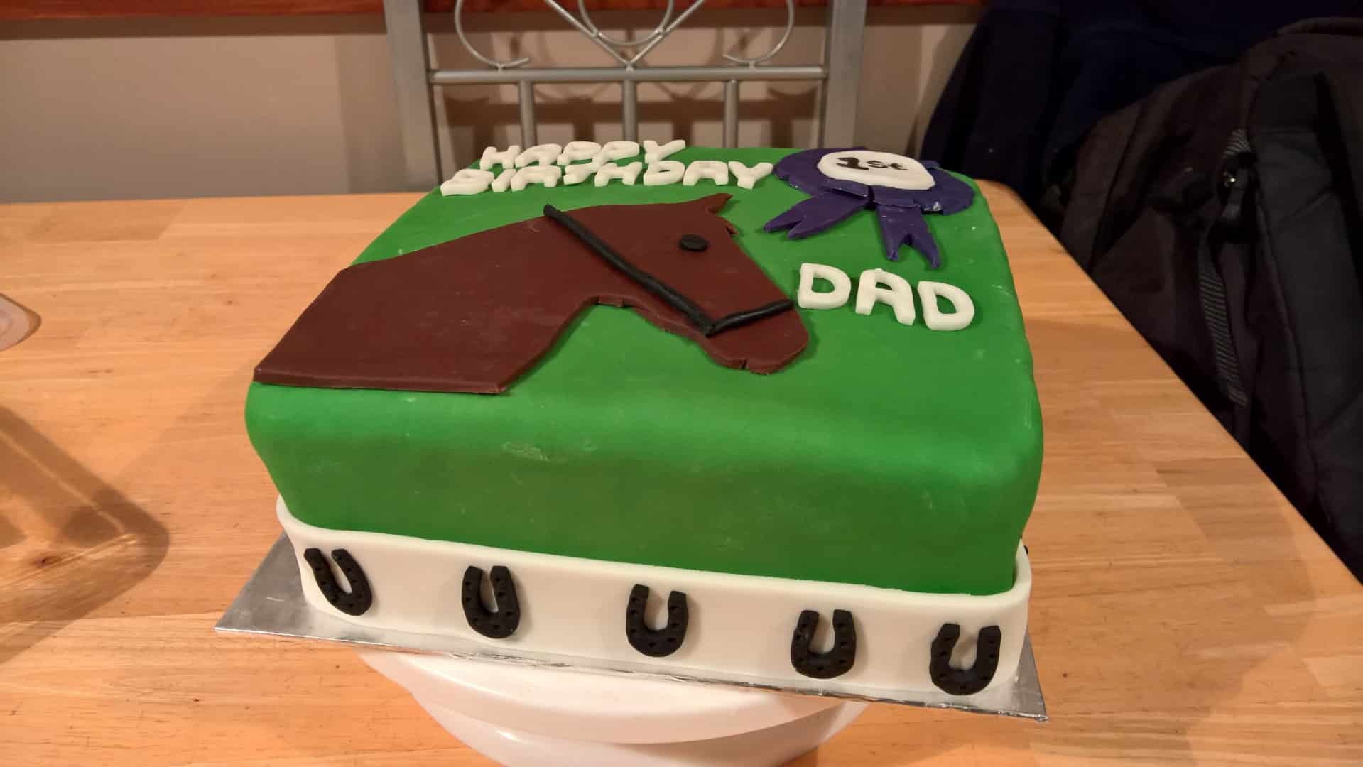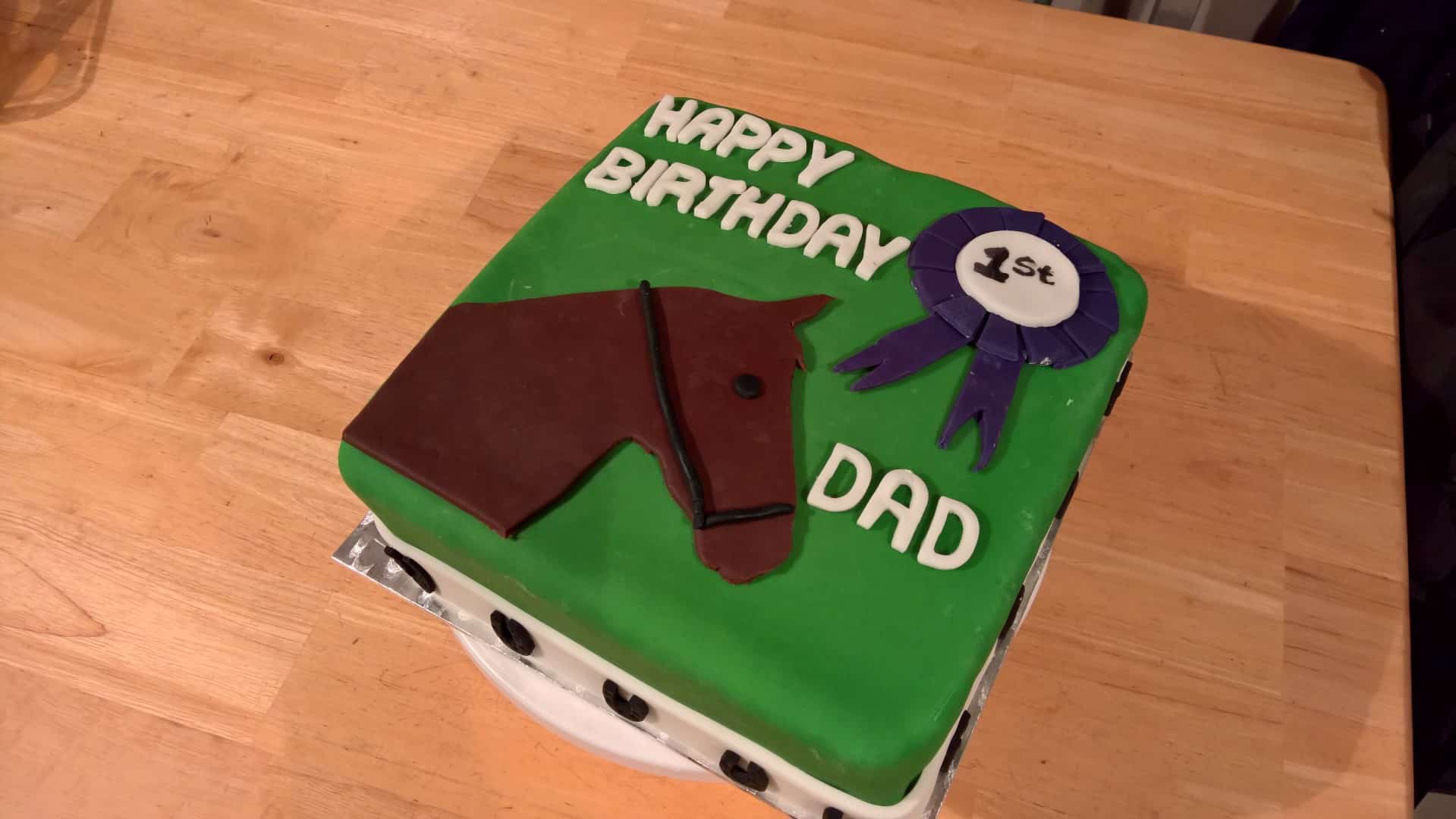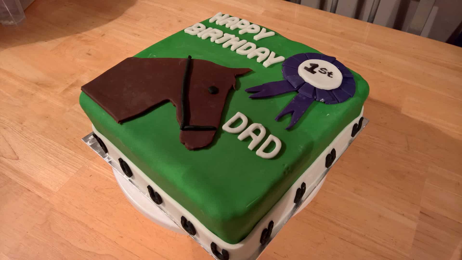 Birthday Cake – Horses £25 This cake features a horse and rosette made of icing, along with horseshoe icing decorations along the sides.