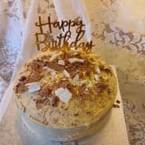 A birthday cake with personalised writing. This cake is a 7″ sponge cake.