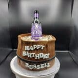 This Prosecco Celebration birthday cake features a chocolate sponge with chocolate ganache filling and topping. Topped with a solid chocolate bottle with butter cream bubbles.