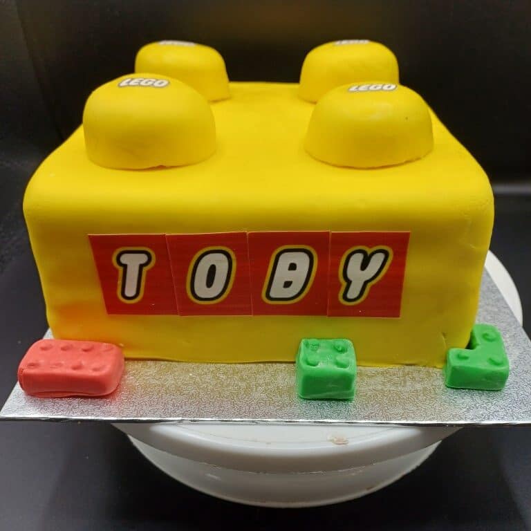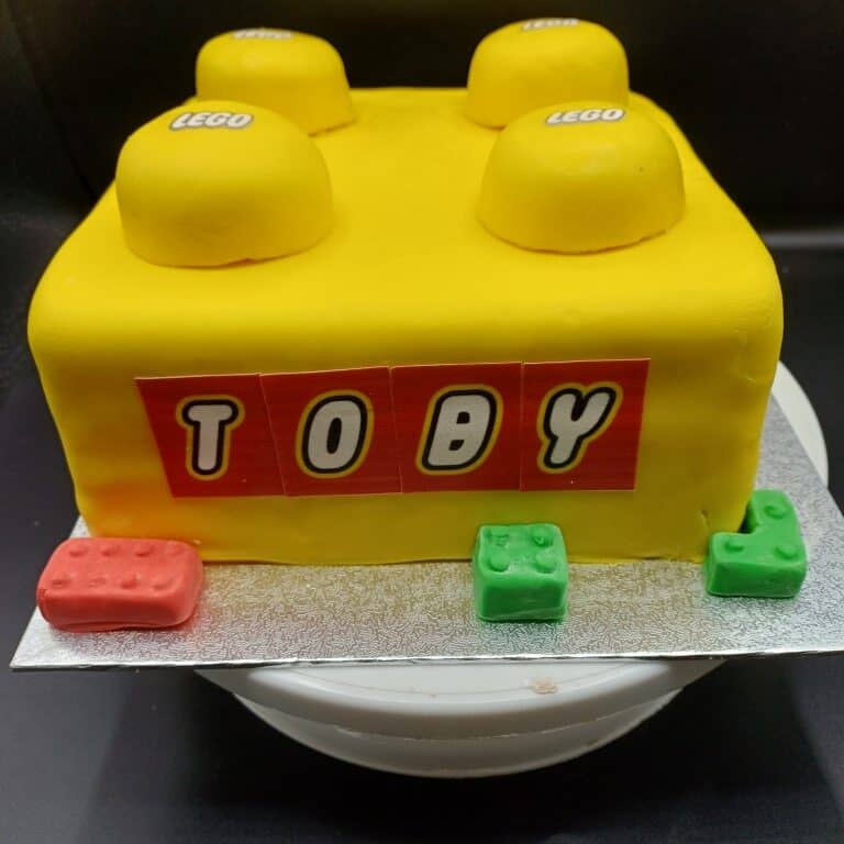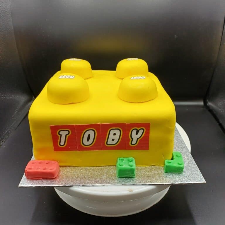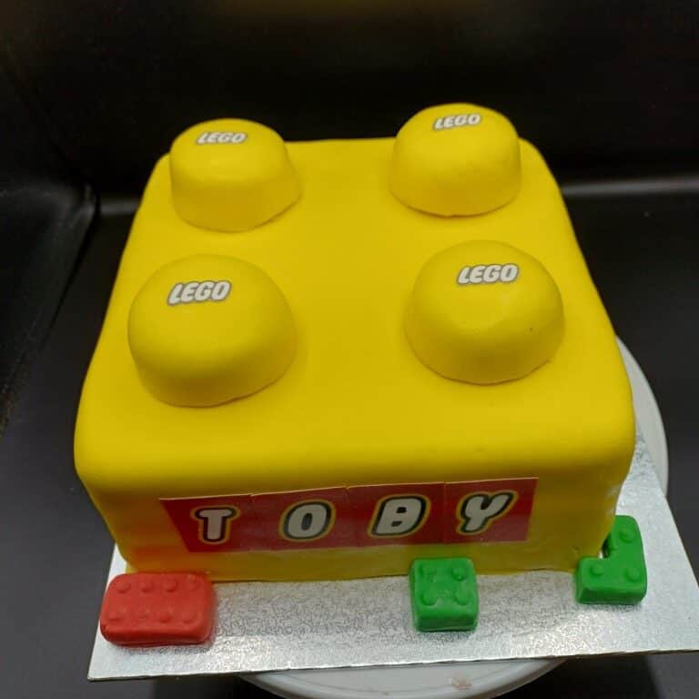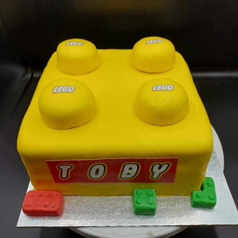 To match Toby’s favourite building bricks, Debbie baked a beautifully light vanilla sponge, layered generously with smooth vanilla buttercream and a classic strawberry jam filling. The cake was then carefully sculpted into the unmistakable shape of a LEGO brick—complete with raised studs on top!