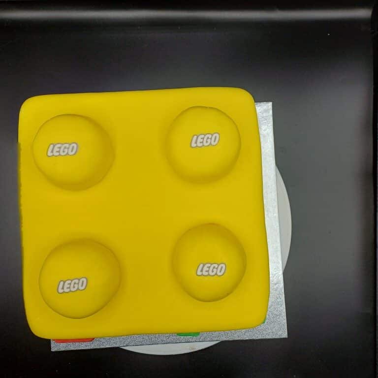 a bright yellow LEGO block… made entirely of cake!