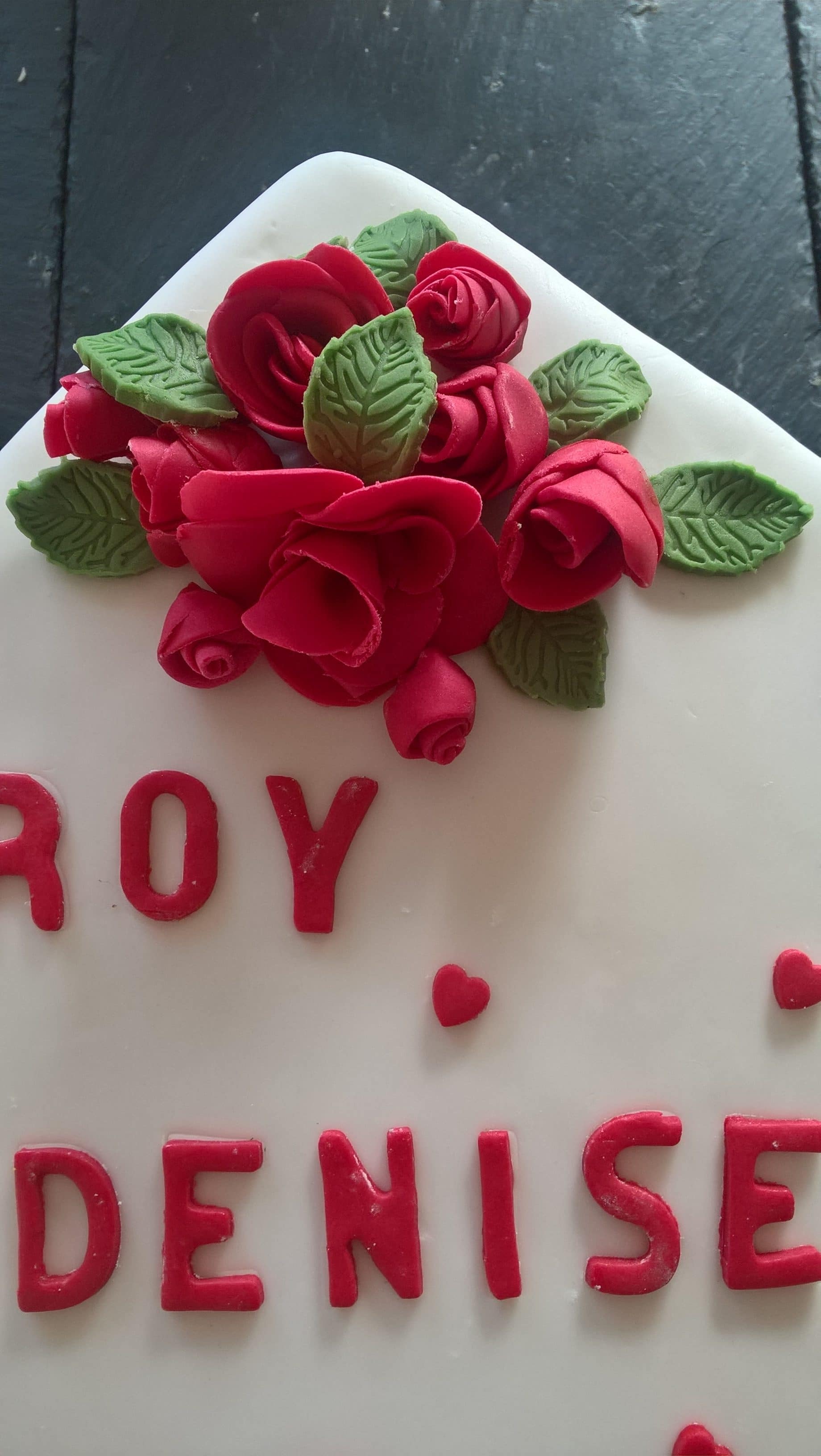 Anniversary Cake – 40th Roses This stunning 40th anniversary cake is a vanilla sponge filled with vanilla butter cream and jam with hand made fondant roses and love hearts.