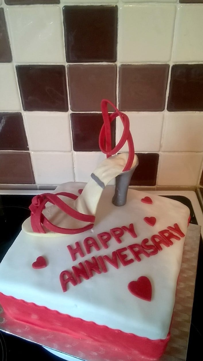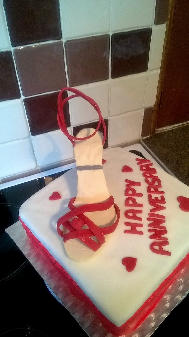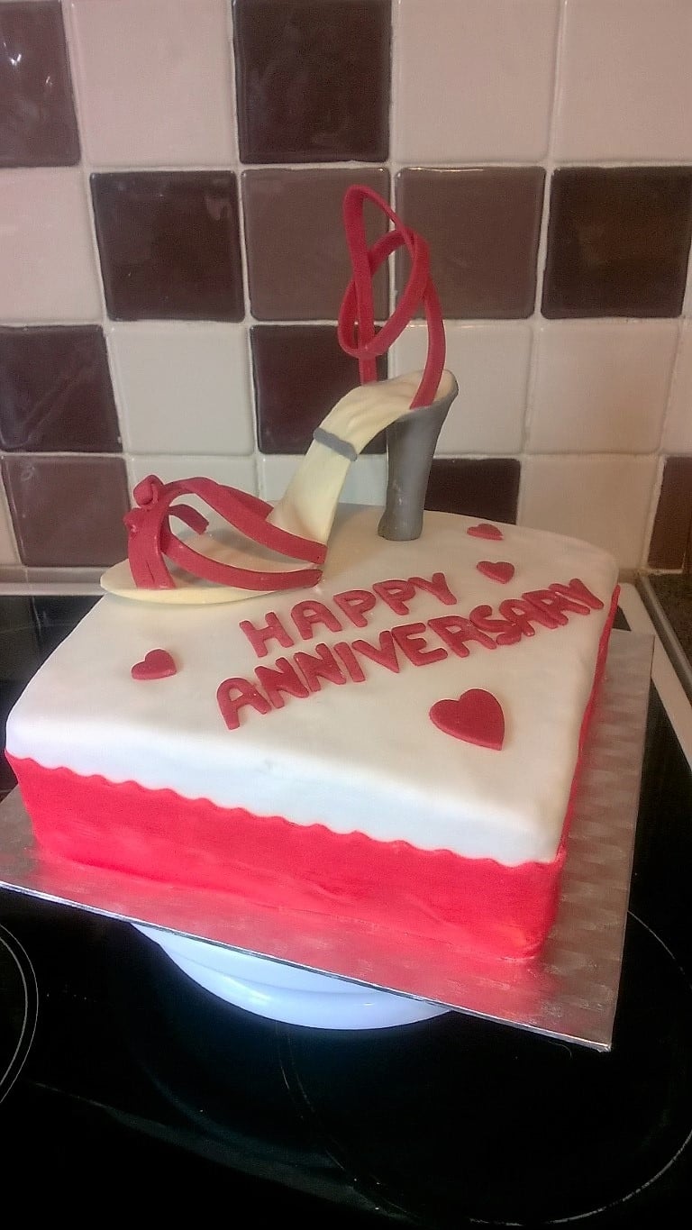 Anniversary Cake – Party Shoe An Anniversary cake with red love hearts and a party shoe decoration. For prices, please contact Debbie.
