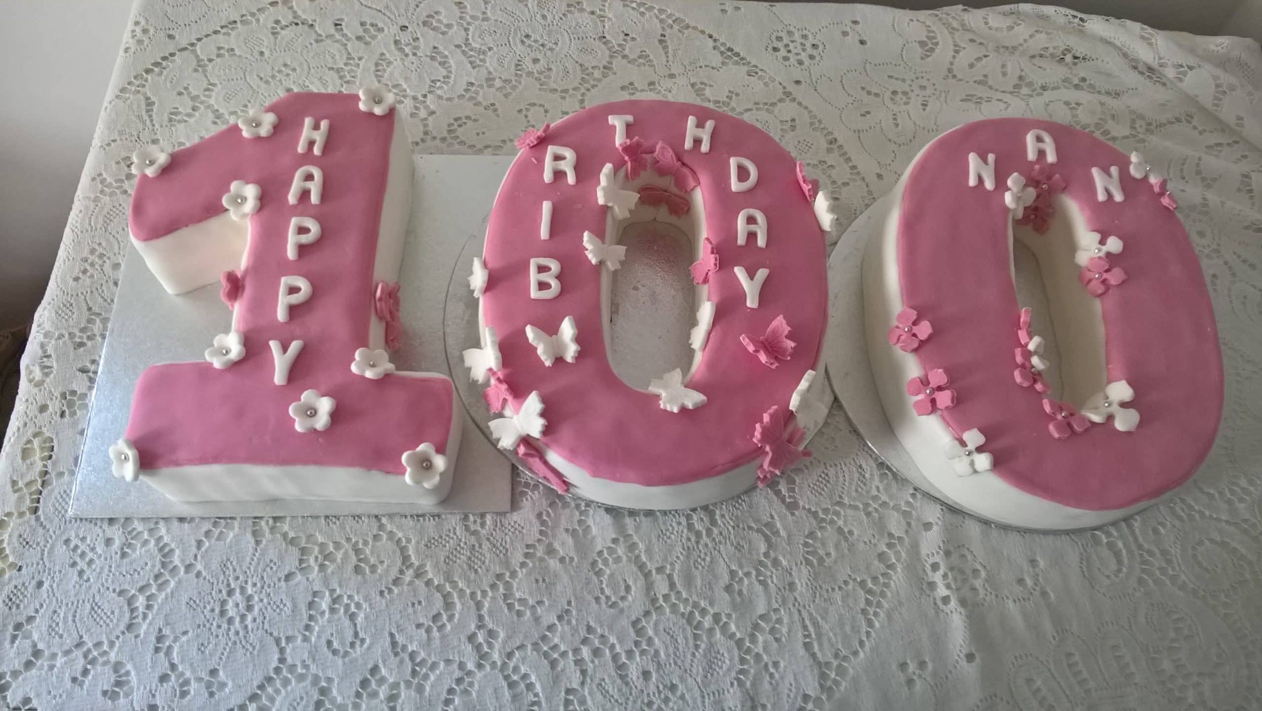 Birthday Cake – 100th Butterfly and Flower Cake This beautiful cake decorated with hand made flowers and butterflies was made to celebrate a 100th birthday! Vanilla sponge cake filled with sweet strawberry jam!