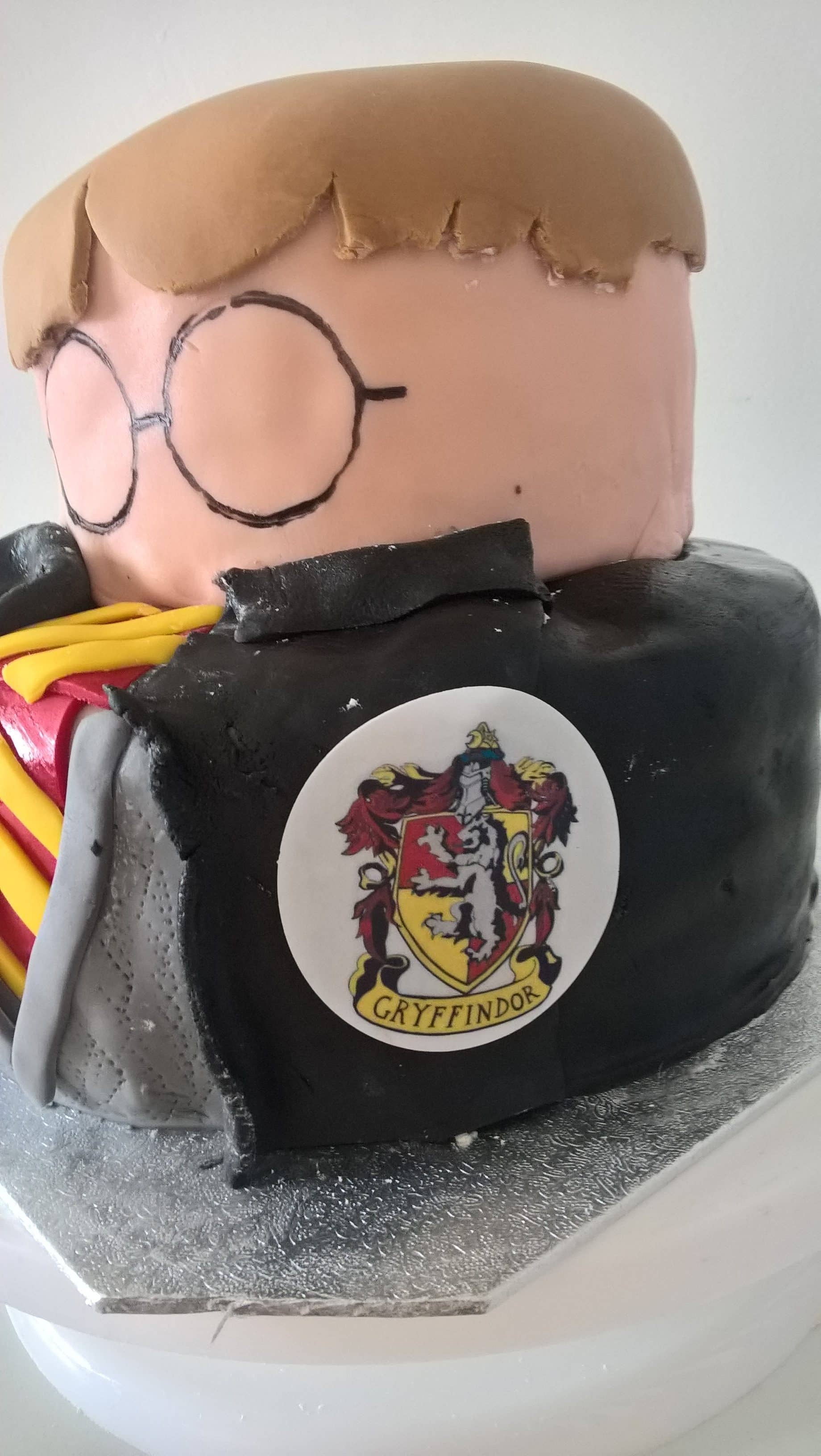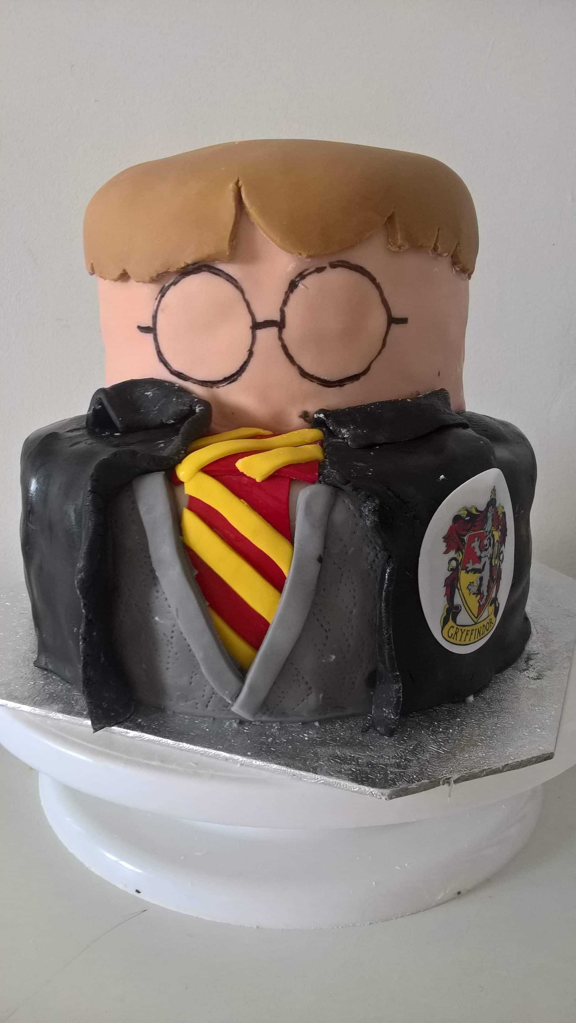 A magical Harry Potter cake that is vanilla sponge filled with strawberry jam on bottom tier and the second tier is chocolate sponge with chocolate buttercream.