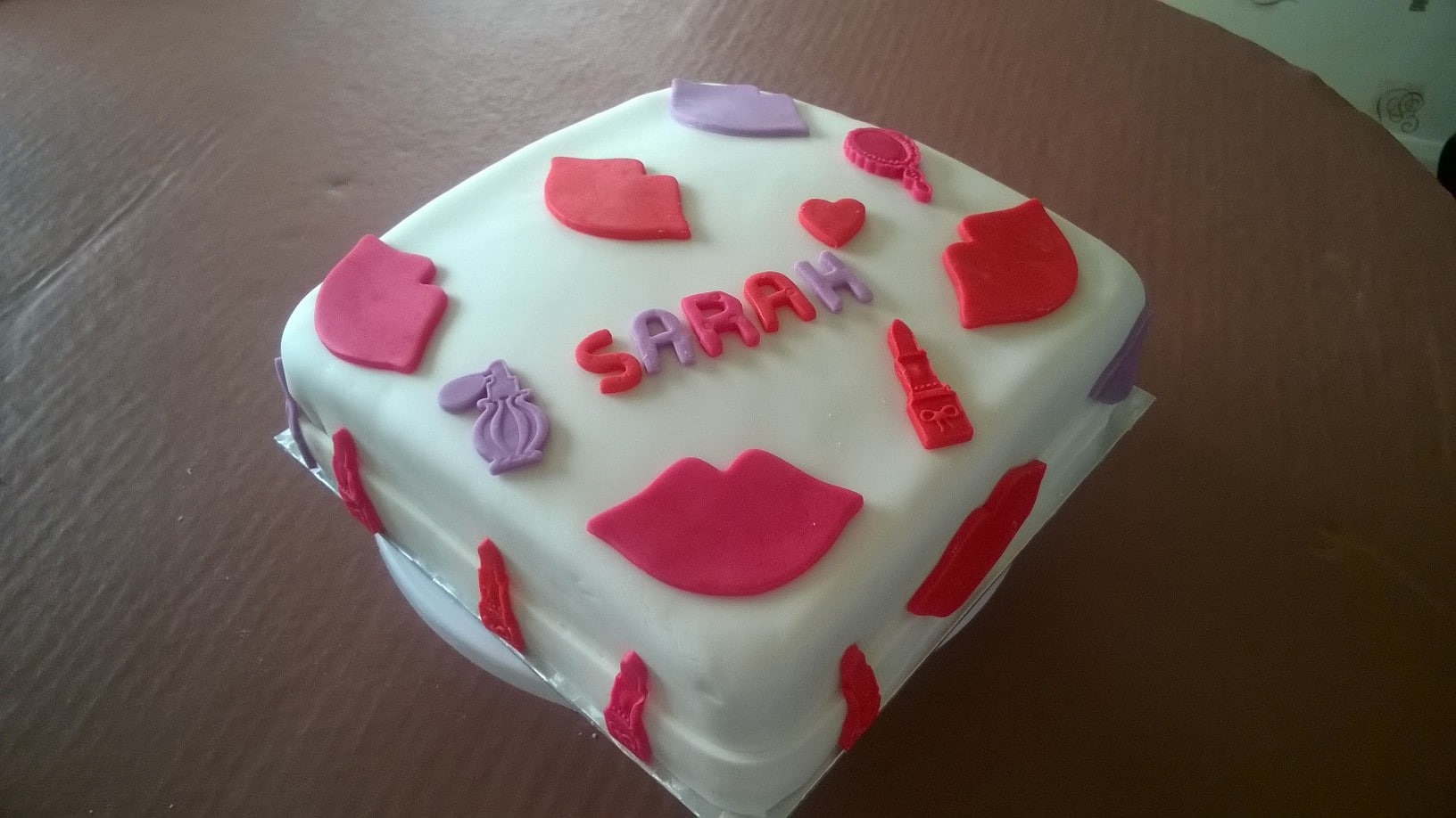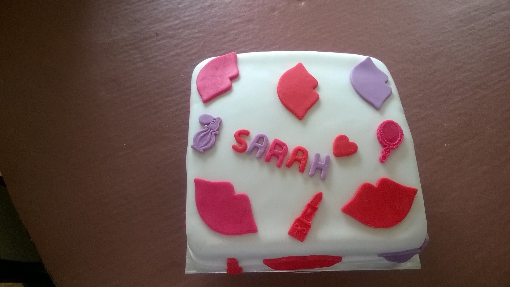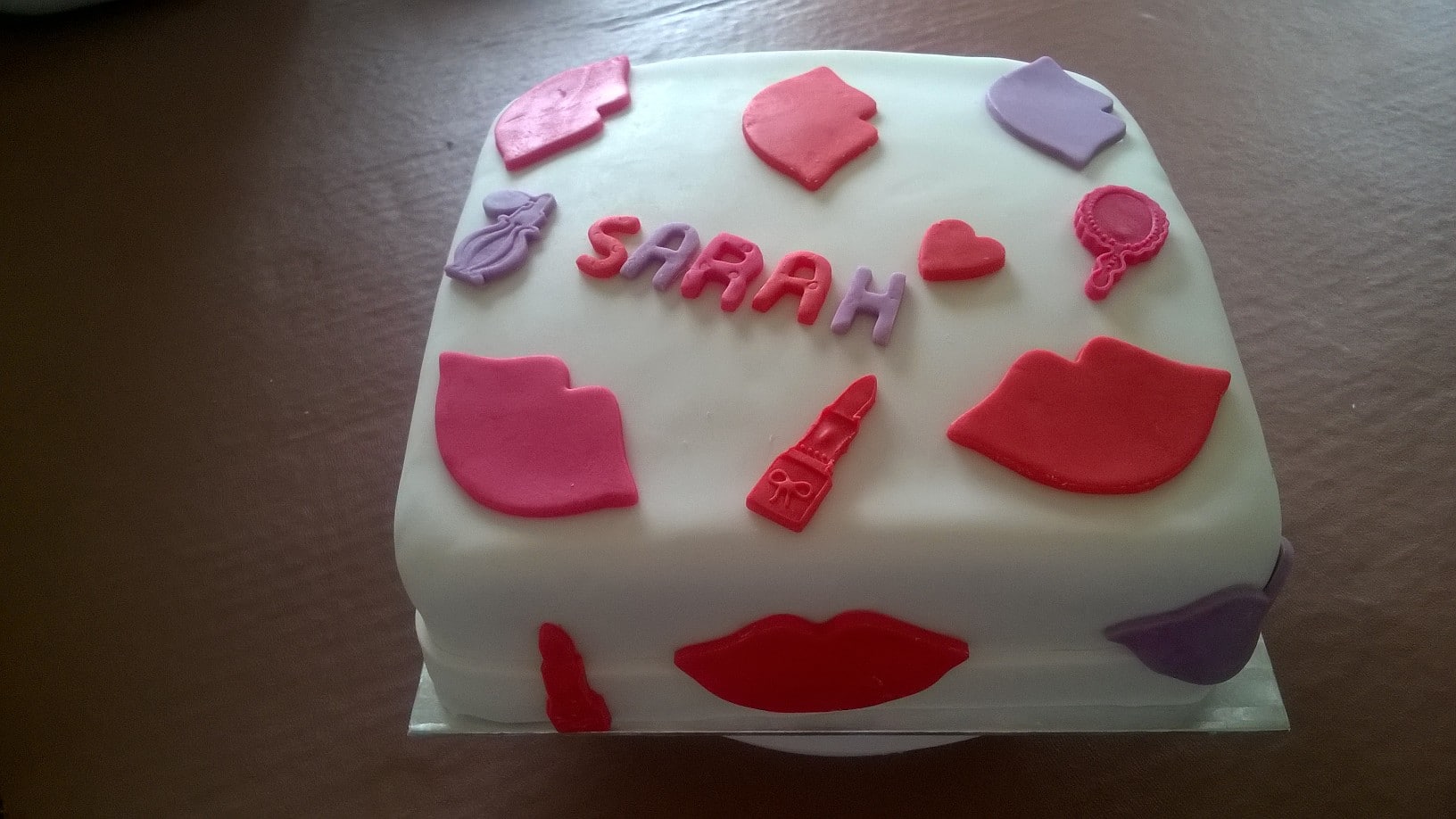 A birthday cake featuring lips and makeup icing decorations.
