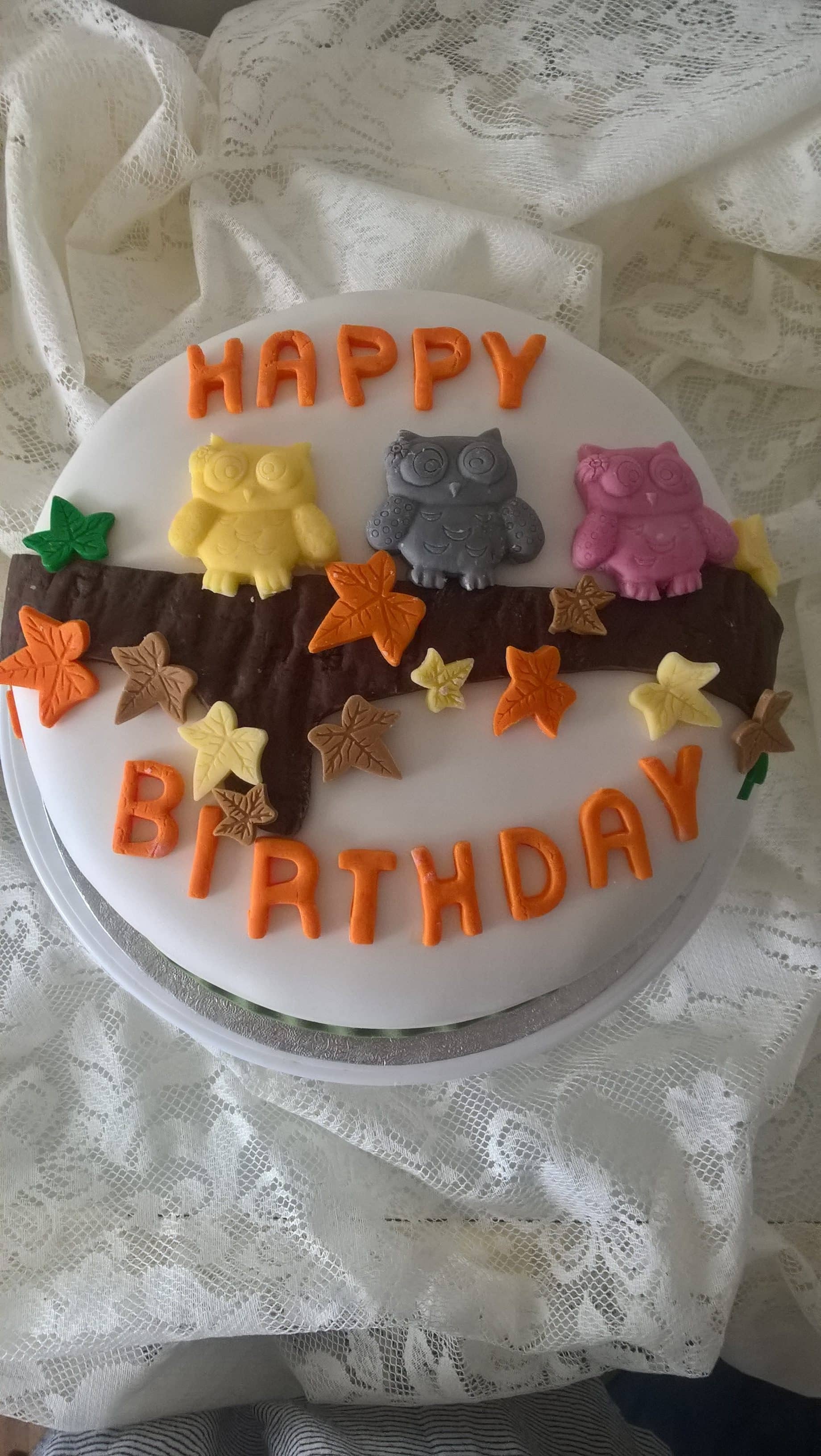 A beautifully decorated vanilla sponge filled with vanilla buttercream and strawberry jam. The owls, branches and leaves are all hand made out of icing.