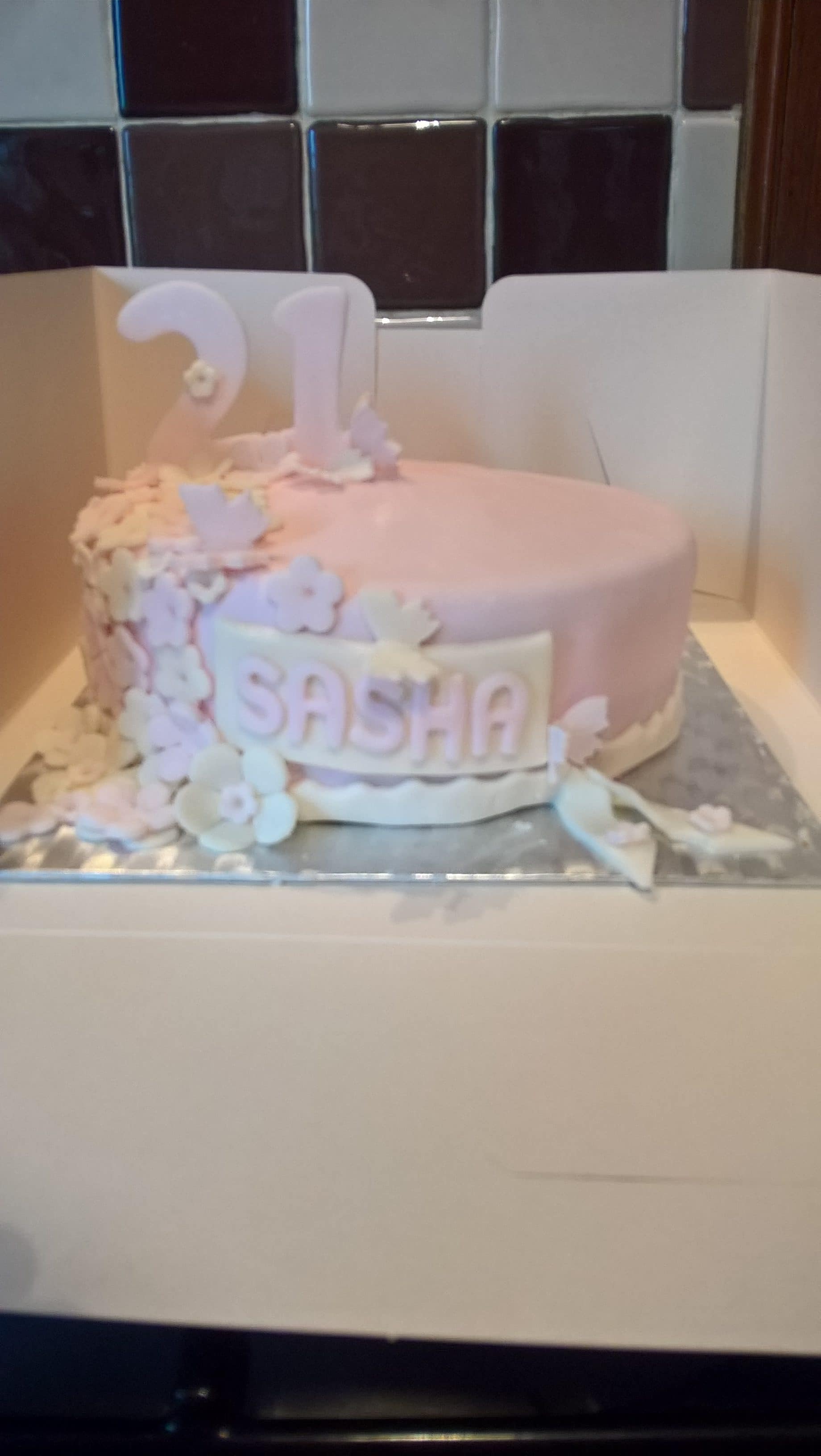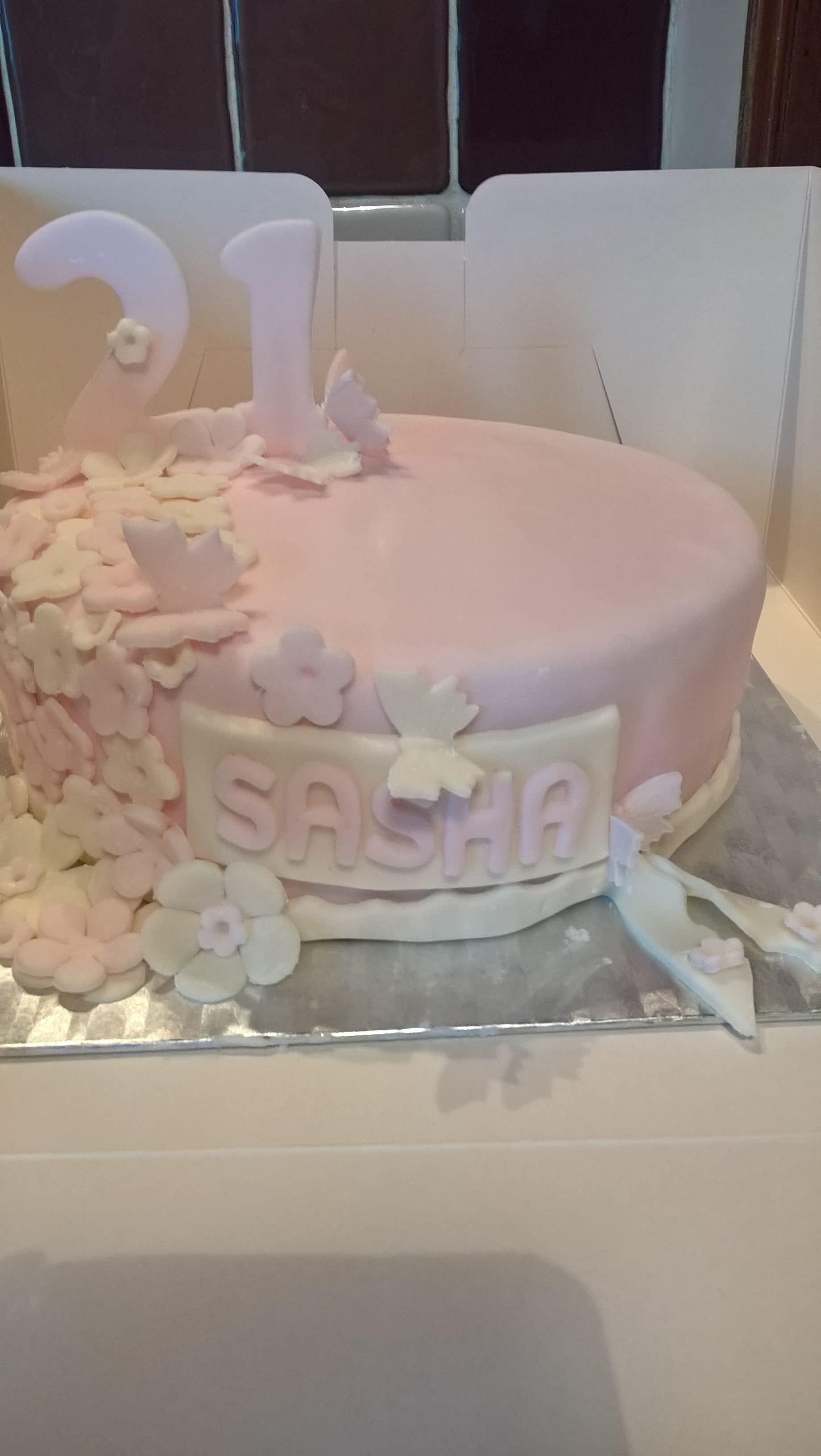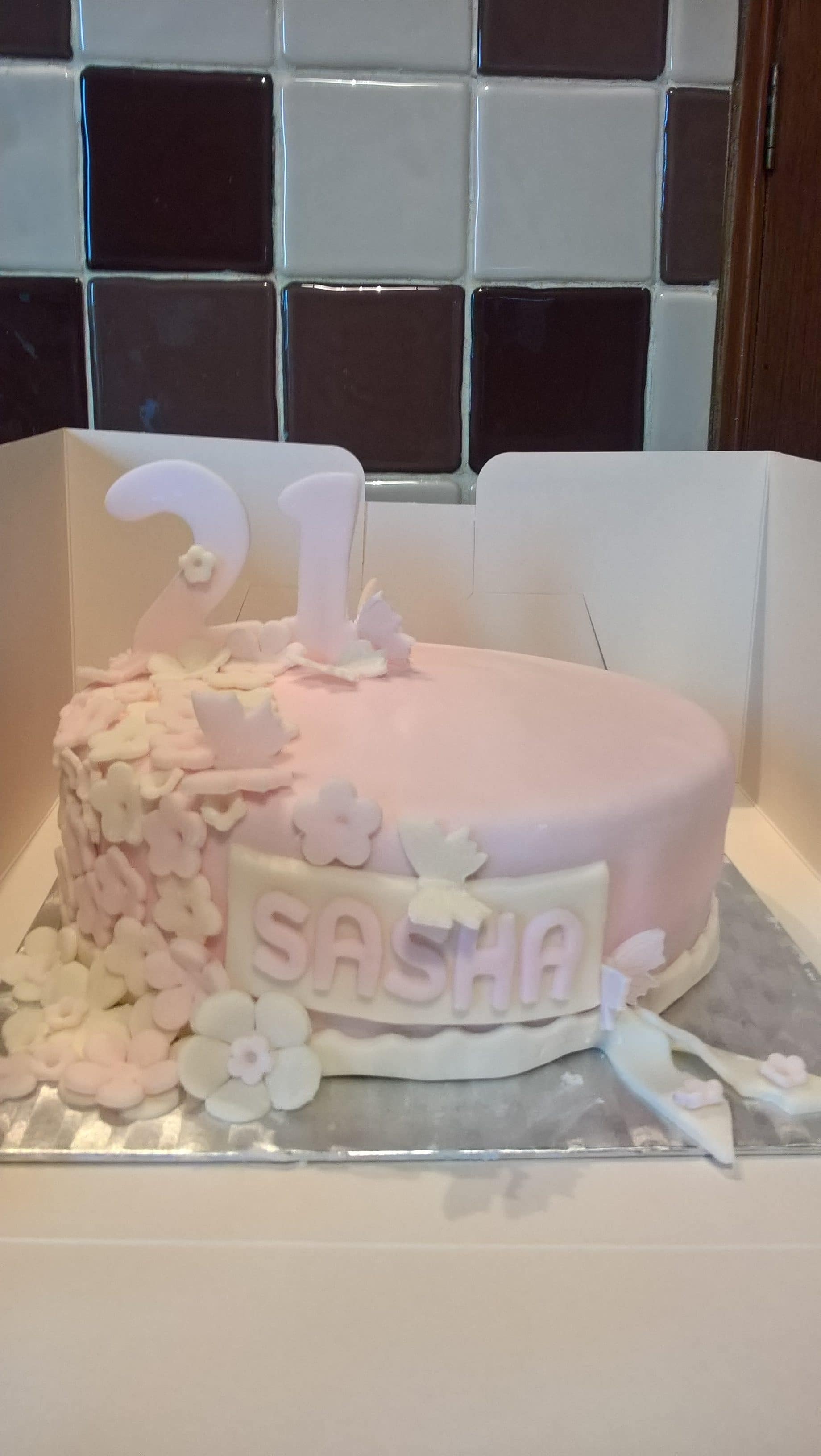 Birthday Cake – Pink and White Flowers A beautiful Victoria Sponge, lovingly decorated with handcrafted flowers, butterflies, and ribbons. Filled with vanilla buttercream and strawberry jam. A truly gorgeous and eye catching birthday cake.