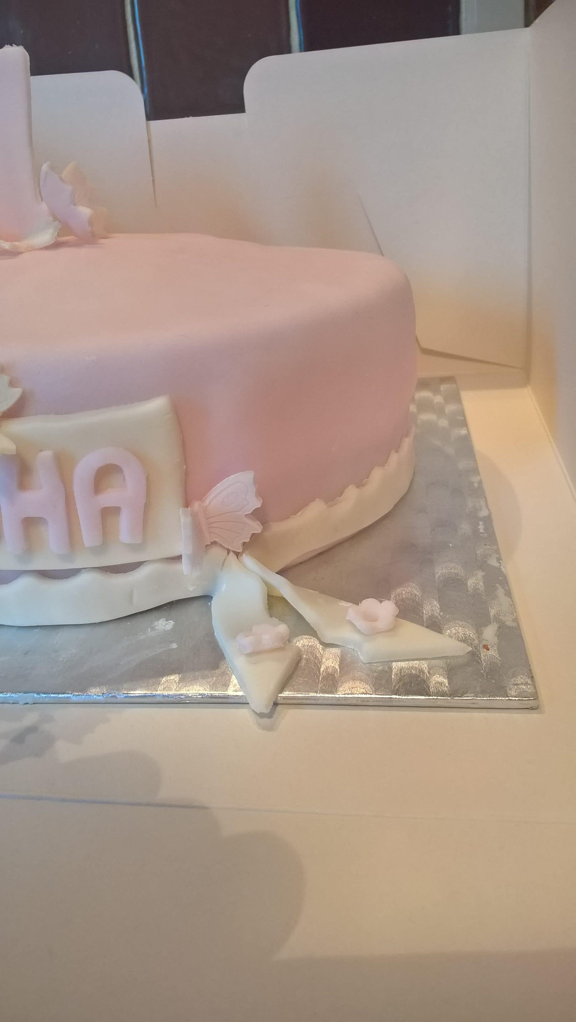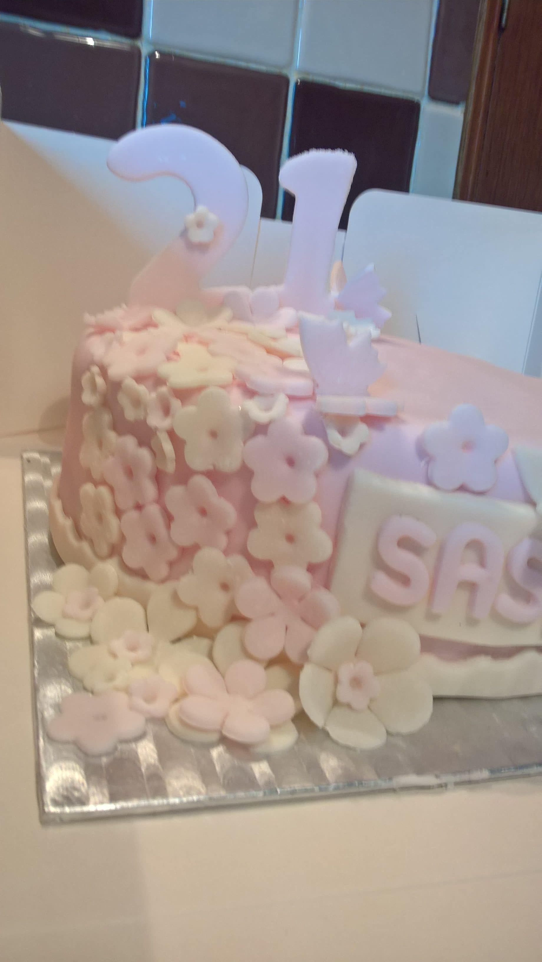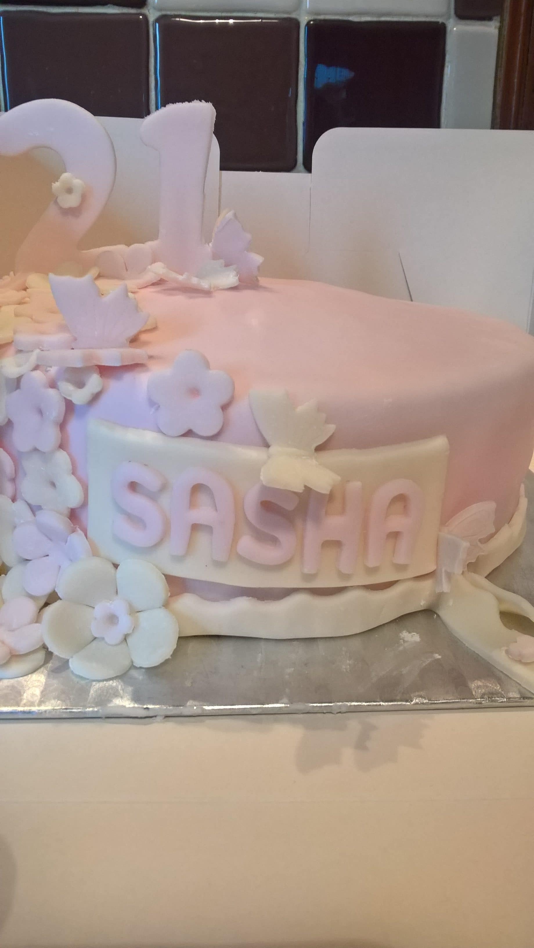 Birthday Cake – Pink and White Flowers A beautiful Victoria Sponge, lovingly decorated with handcrafted flowers, butterflies, and ribbons. Filled with vanilla buttercream and strawberry jam. A truly gorgeous and eye catching birthday cake.