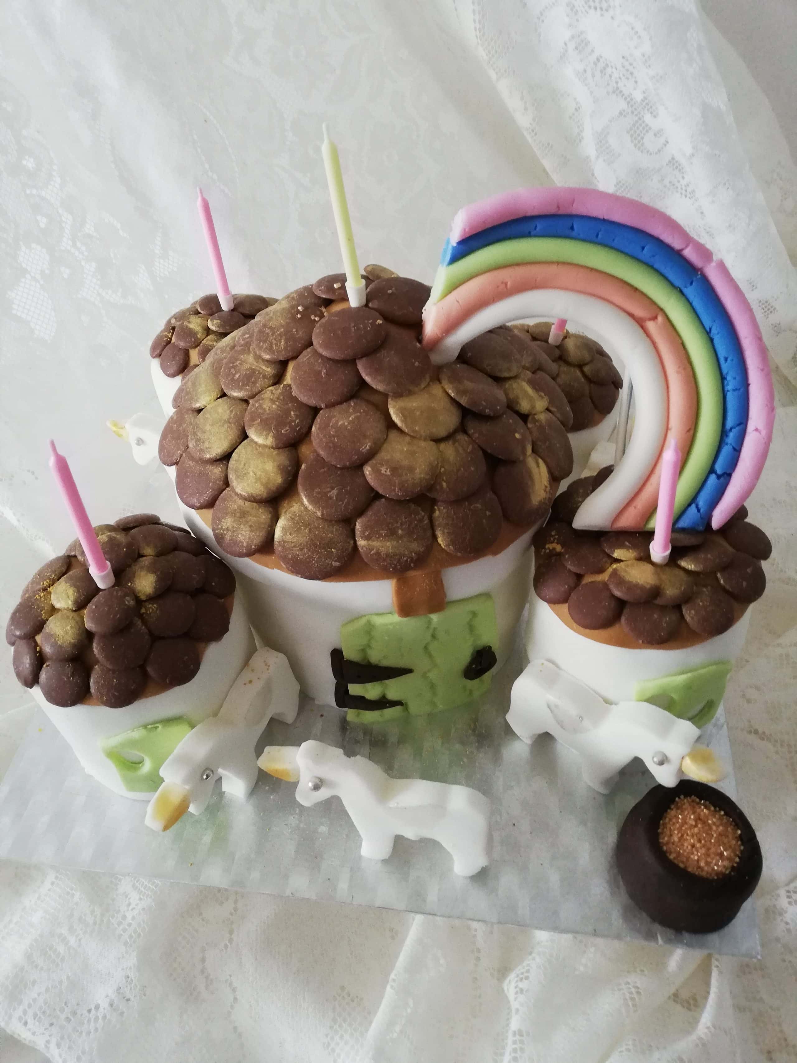 One large vanilla sponge, surrounded by 4 smaller sized cakes all filled with vanilla butter cream and strawberry jam, decorated as a magical castle.