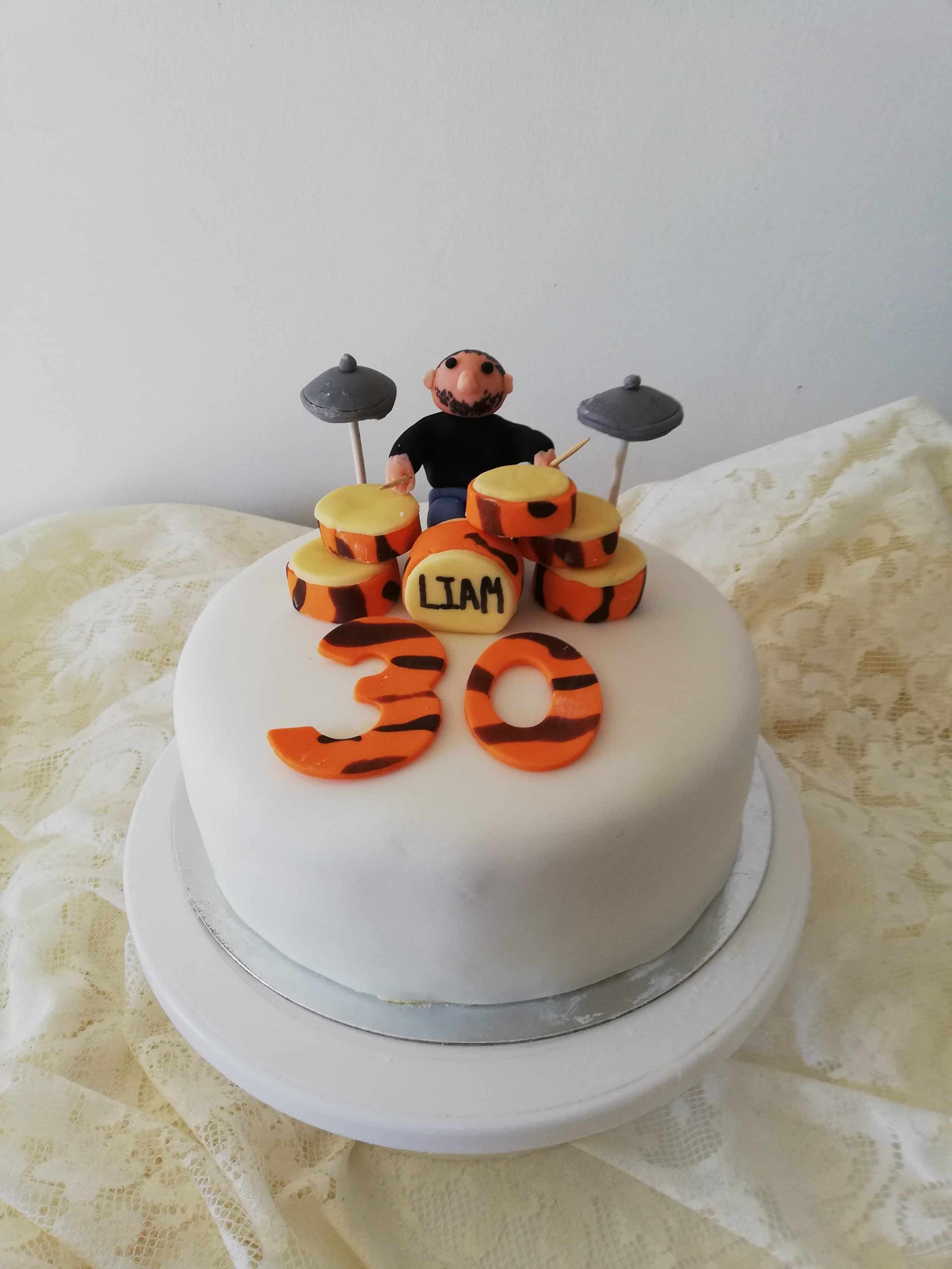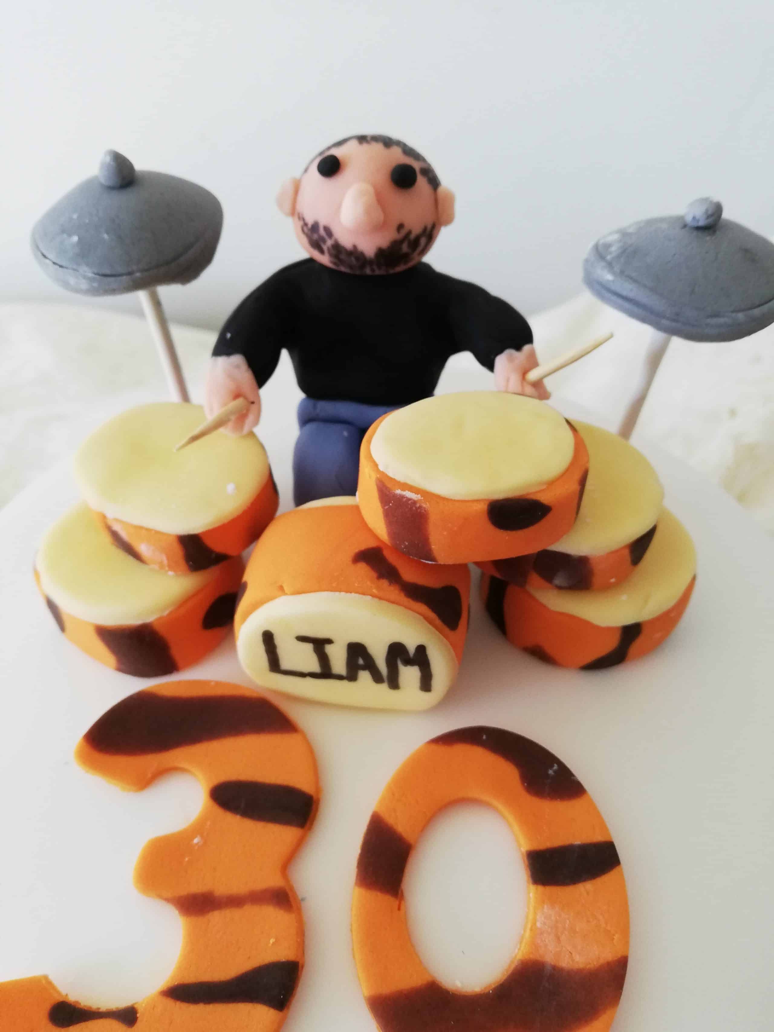Birthday Cake – Tiger Print Drum Kit A vanilla buttercream and strawberry jam filled sponge cake, proudly sitting on top is a handmade drummer playing an amazing set of tiger print drums! Music never tasted so good! dav dav