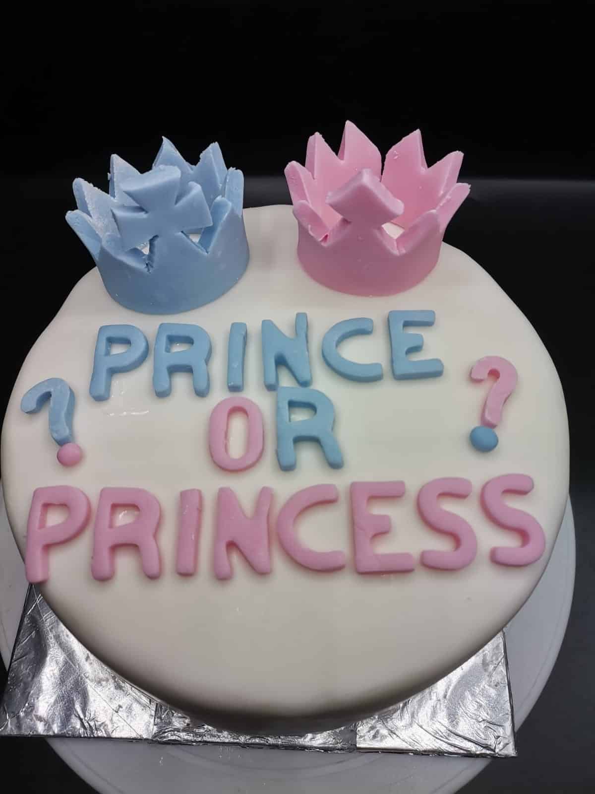 Atop the cake sits a handmade pair of crowns, a blue crown, and a pink crown made from fondant icing.
