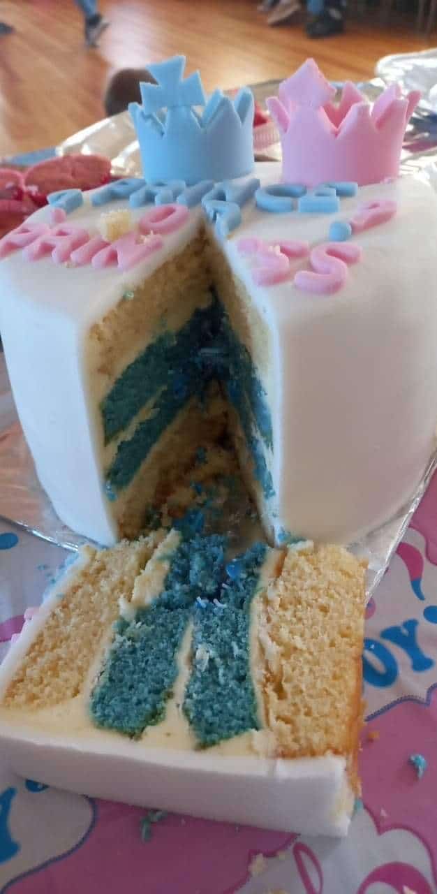 We received the ultrasound, which was a little boy! So, the buttercream inside the cake had been made blue. The parents to be cut the cake to find out what they are having. A wonderful way to find out the gender!